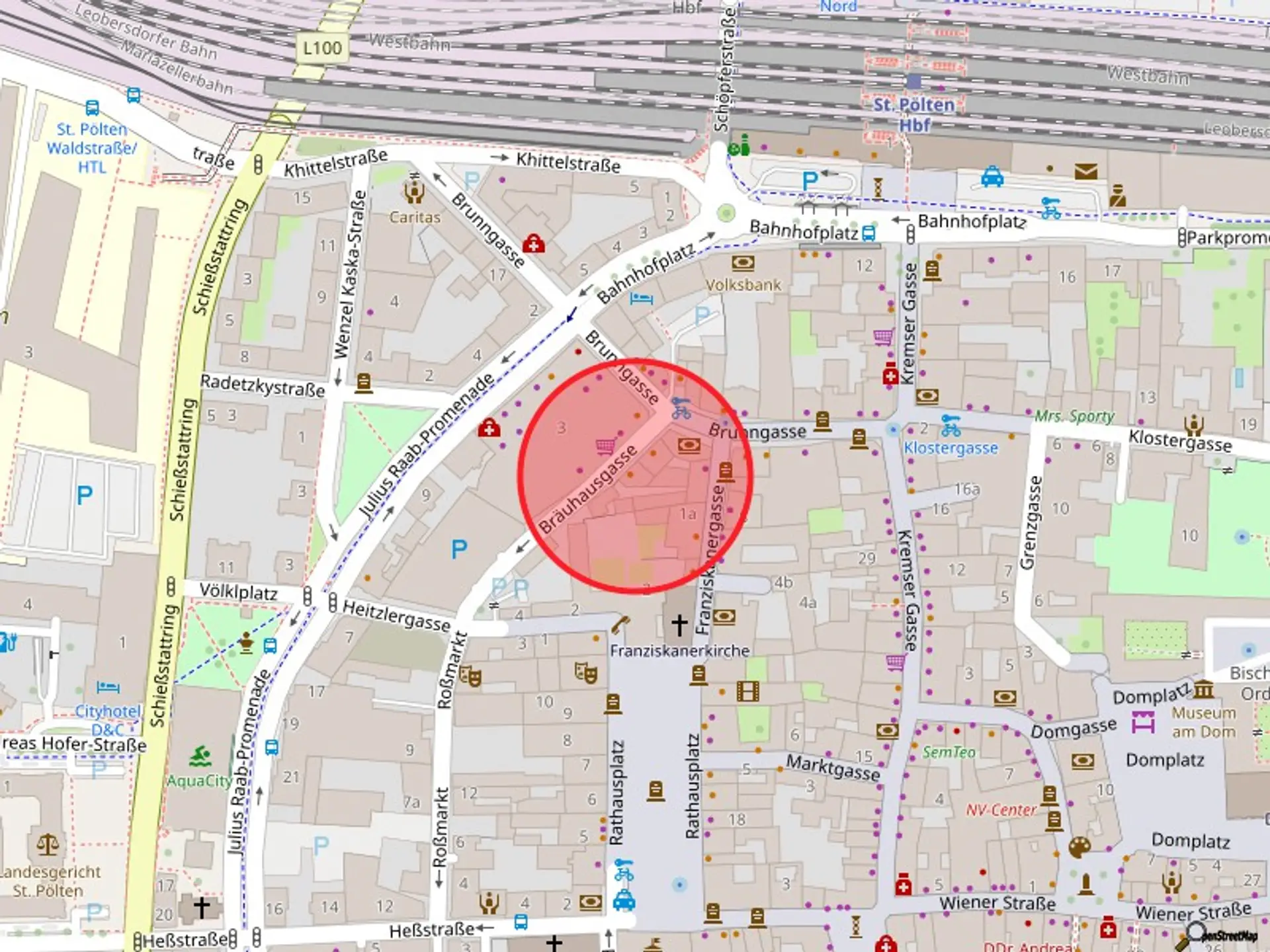 Die Wohnung ist in einer sehr guten Lage in der Fußgängerzone von St. Pölten situiert. Vor allem hinsichtlich Infrastruktur bleiben kaum Wünsche offen, denn das Einkaufszentrum Promenade befindet sich direkt gegenüber und bietet neben diversen Kleidungsgeschäften auch einen Bille, einen Bipa und mehrere medizinische Einrichtungen. Für all jene, welche auf die Bahn angewiesen sind ist es durchaus komfortabel, dass der Hauptbahnhof lediglich wenige Gehminuten entfernt ist.