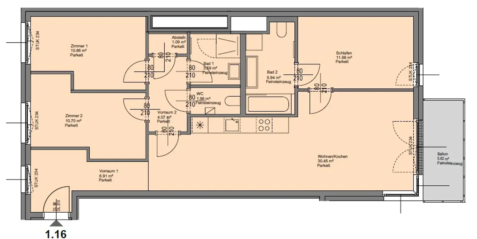 Vorzimmer, Durchgang, Wohnküche, 3 Zimmer, 2 Badezimmer, WC, Abstellraum, Kellerabteil.