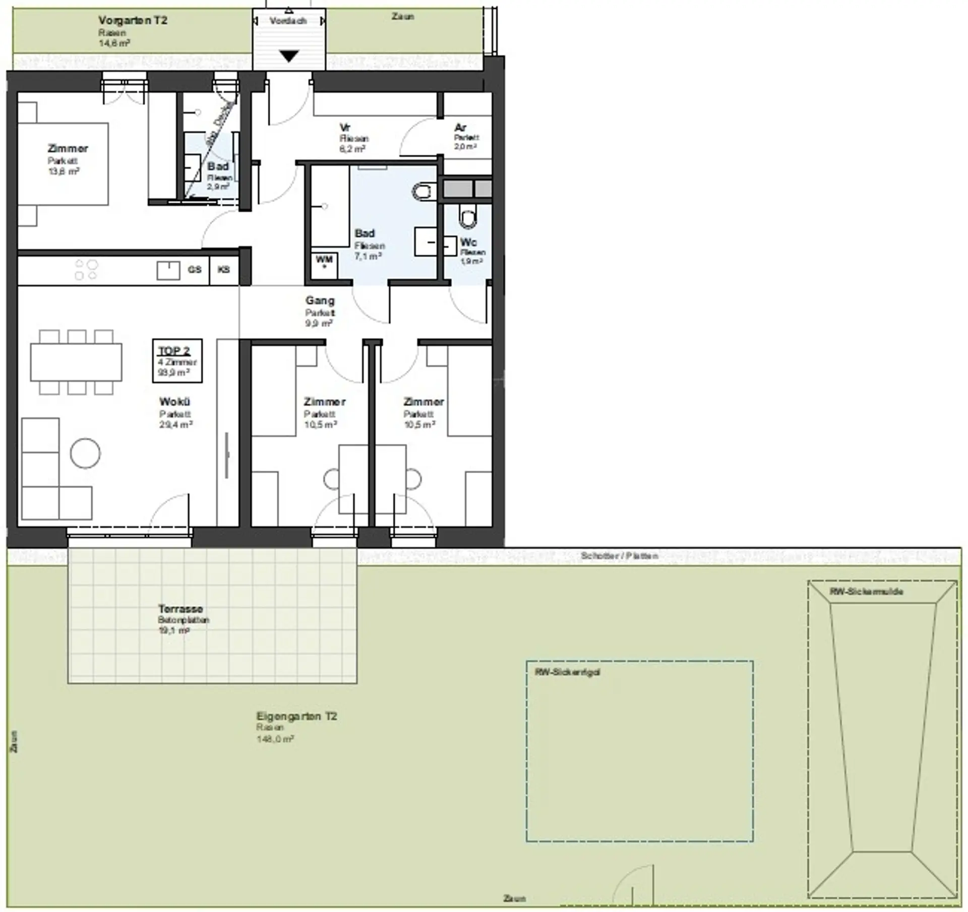 Die im Erdgeschoß geplante Wohnung Top 2 (Lift ist vorhanden) mit ca. 93,9 m² Wohnnutzfläche, einer Terrasse mit ca. 19,1 m² und einem Garten mit ca. 162,6 m² verfügt über folgende Raumaufteilung: