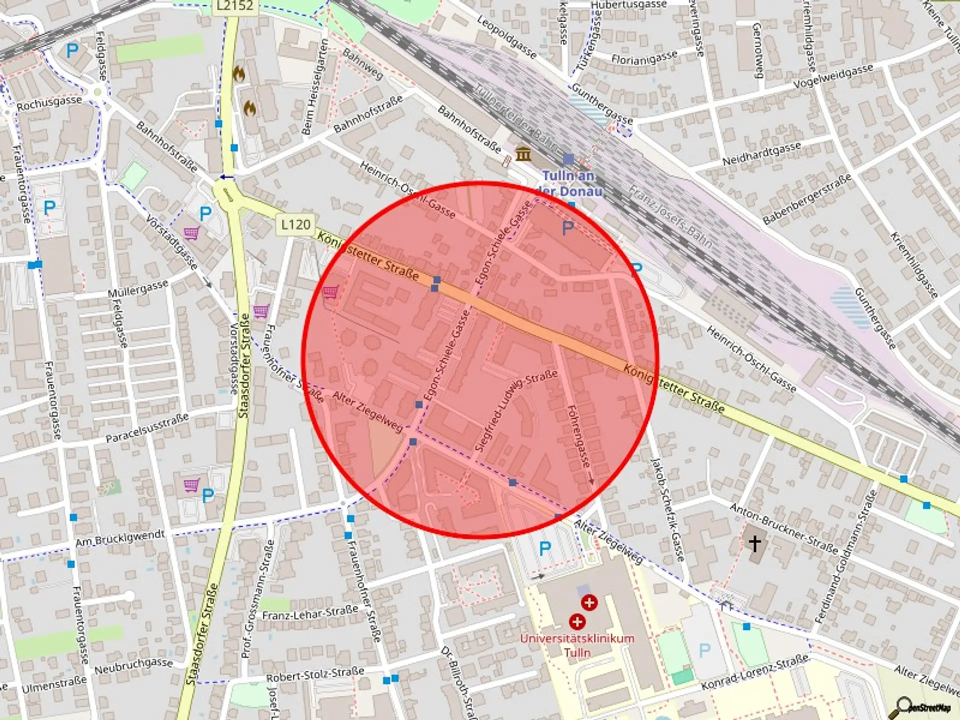Die Liegenschaft befindet sich in der Königstetterstraße in Tulln, einer gut frequentierten Lage mit ausgezeichneter Infrastruktur. Einkaufsmöglichkeiten, Schulen, die Universitätsklinik sowie der Bahnhof sind in wenigen Minuten erreichbar. Die Nähe zur Donau und zu Naherholungsgebieten bietet zusätzlich hohen Freizeitwert. Die Kombination aus urbaner Anbindung und naturnahem Umfeld macht diesen Standort besonders attraktiv.