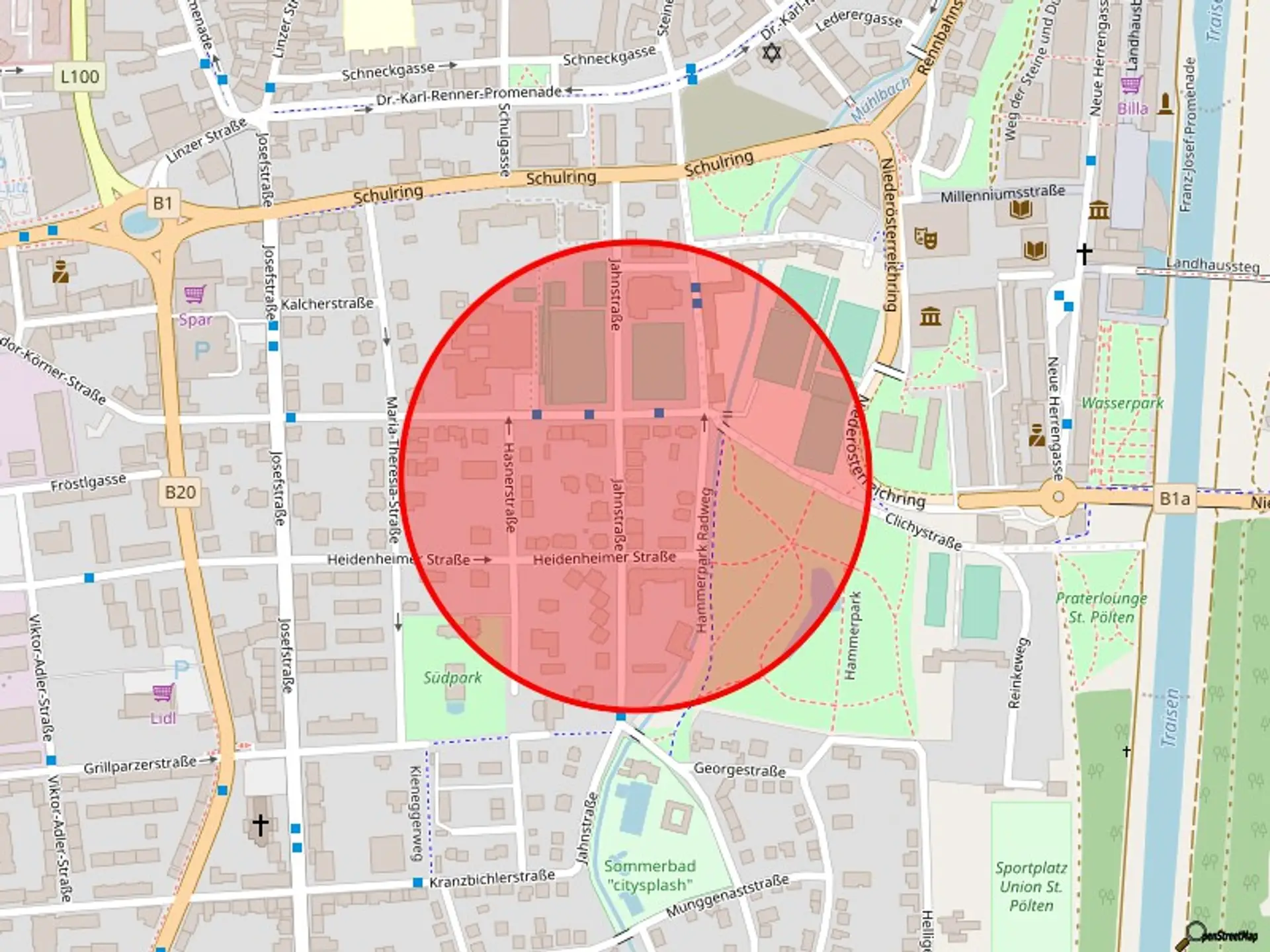 Die Lage kann ohne Zweifel als hervorragend bezeichnet werden. Inmitten des Villenviertels von St. Pölten und nur einen Steinwurf vom Hammerpark entfernt bietet die Wohnung eine angenehme und ruhige Wohngegend. Auch diverse Einkaufsmöglichkeiten lassen sich in kürzester Zeit bequem mit dem Auto, Fahrrad oder auch zu Fuß erreichen. Mit dem Bus der Linie 7 ist auch der Weg zu weiter entfernten Zielen, darunter auch der Hauptbahnhof rasch bewältigt. Punkto Freizeitangebot lädt der nahegelegene Hammerpark und die Traisendämme zum Spazieren, oder das Freibad zum Schwimmen und entspannen ein.