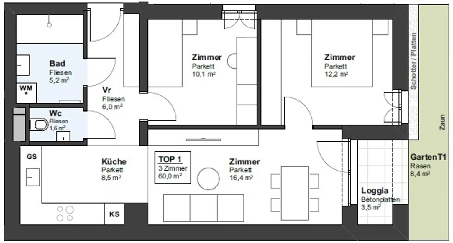 Die im Erdgeschoß geplante Wohnung Top 1 (Lift ist vorhanden) mit ca. 60,00 m² Wohnnutzfläche, einer Loggia von ca. 3,5 m² und einem Garten mit ca. 8,4 m² verfügt über folgende Raumaufteilung:
