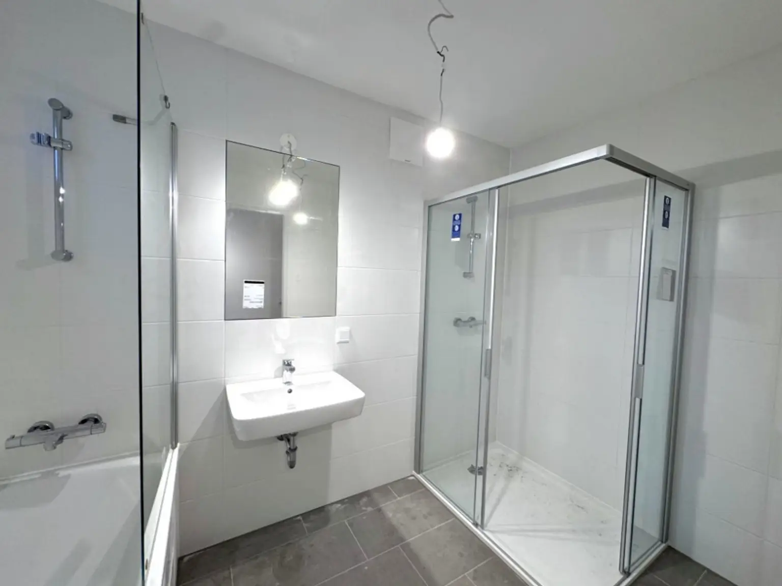 – Großformatfliesen in Badezimmer/WC mit moderner Sanitärausstattung