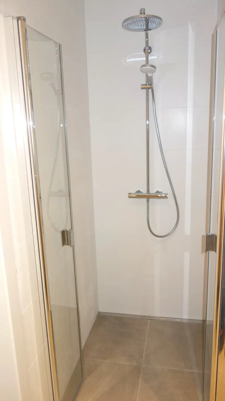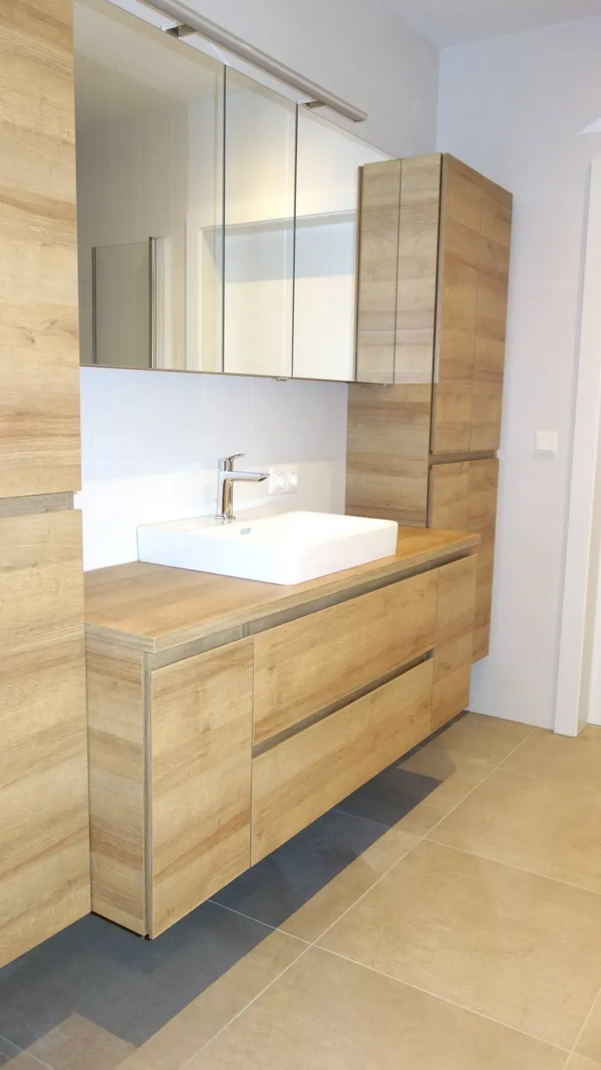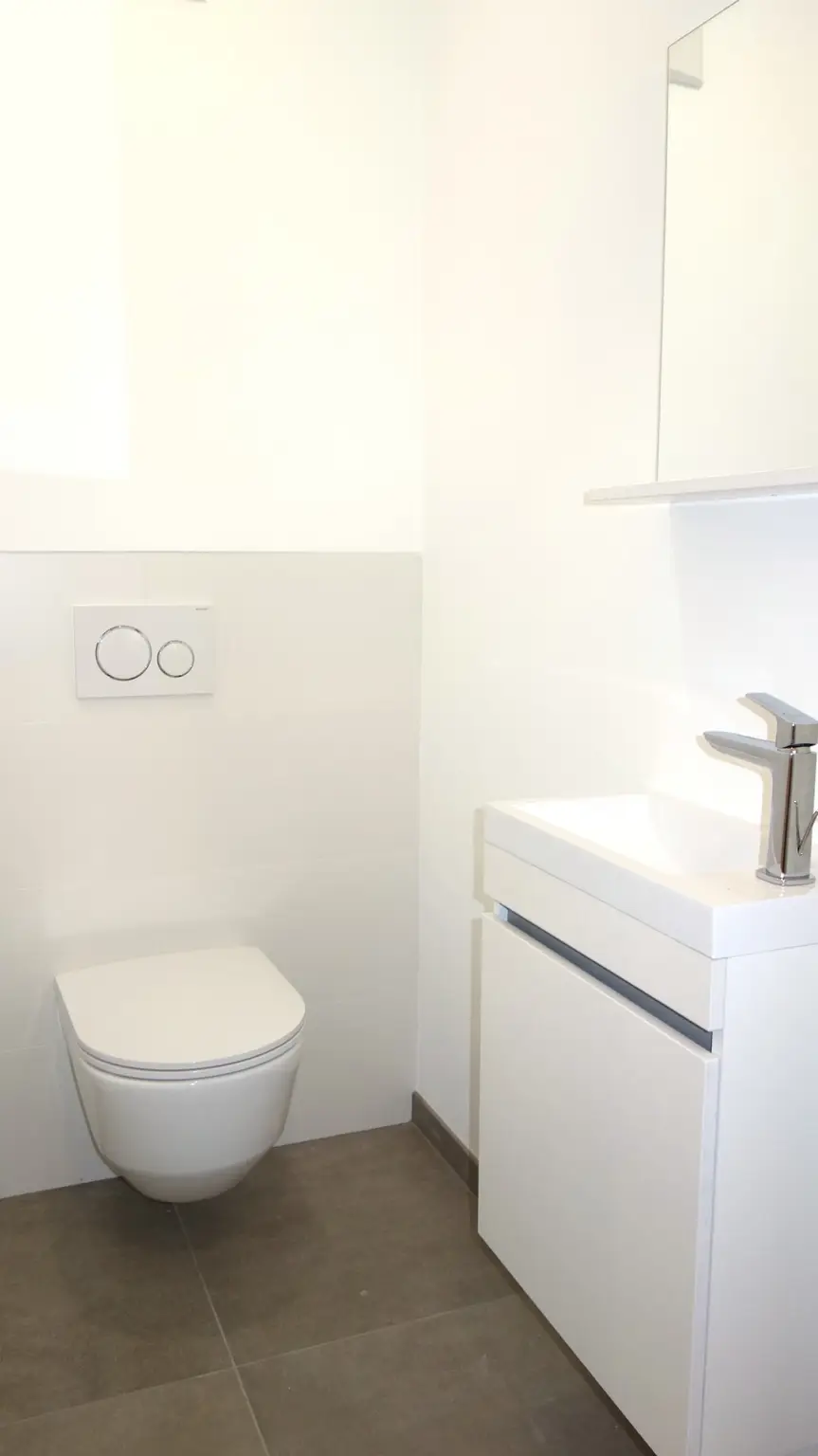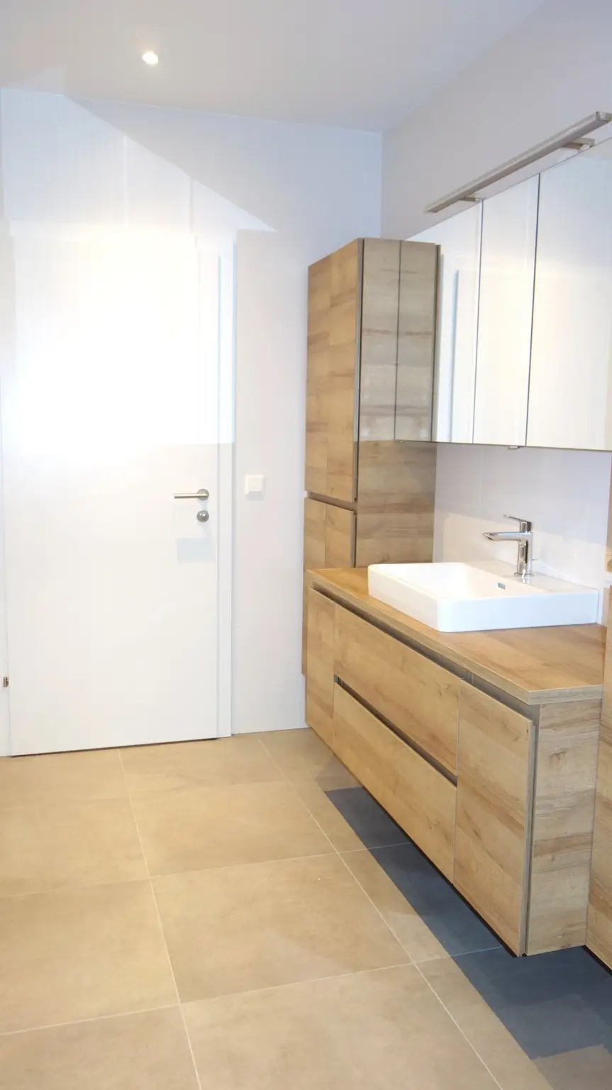 – Großformatfliesen in Badezimmer/WC mit moderner Sanitärausstattung