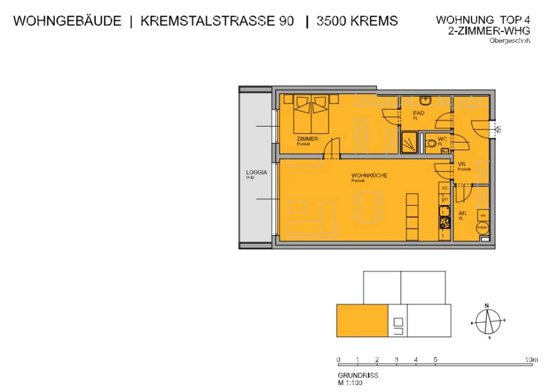 Die im 1.OG befindliche Mietwohnung weist eine Gesamtnutzfläche von ca. 77,74 m² auf und gliedert sich wie folgt: Vorraum, Wohnküche, Schlafzimmer, Badezimmer, Loggia, Abstellraum und WC.
