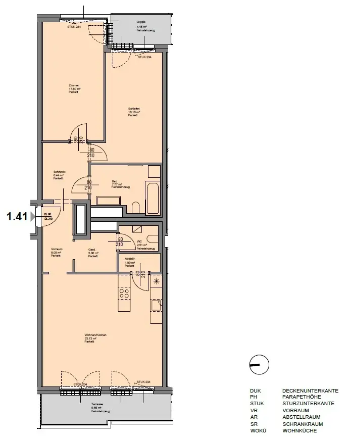 Die Wohnung Top 41 mit 99,10 m² liegt im Dachgeschoß – ein Lift ist selbstverständlich vorhanden – und verfügt über folgendes Raumprogramm: