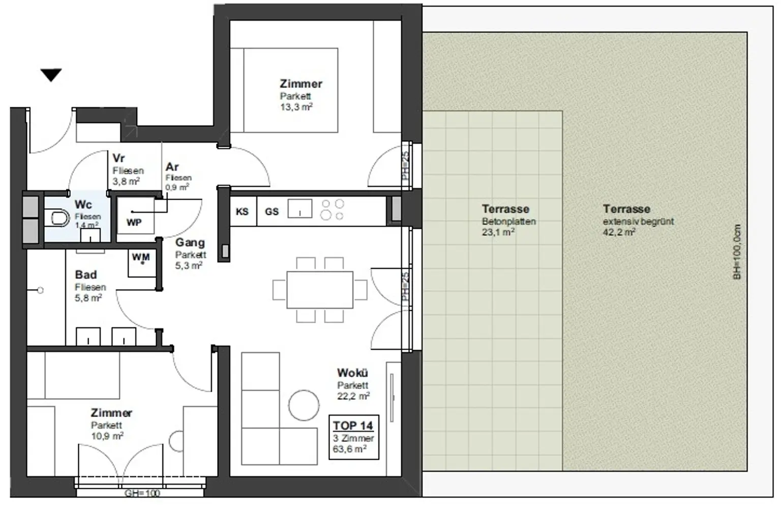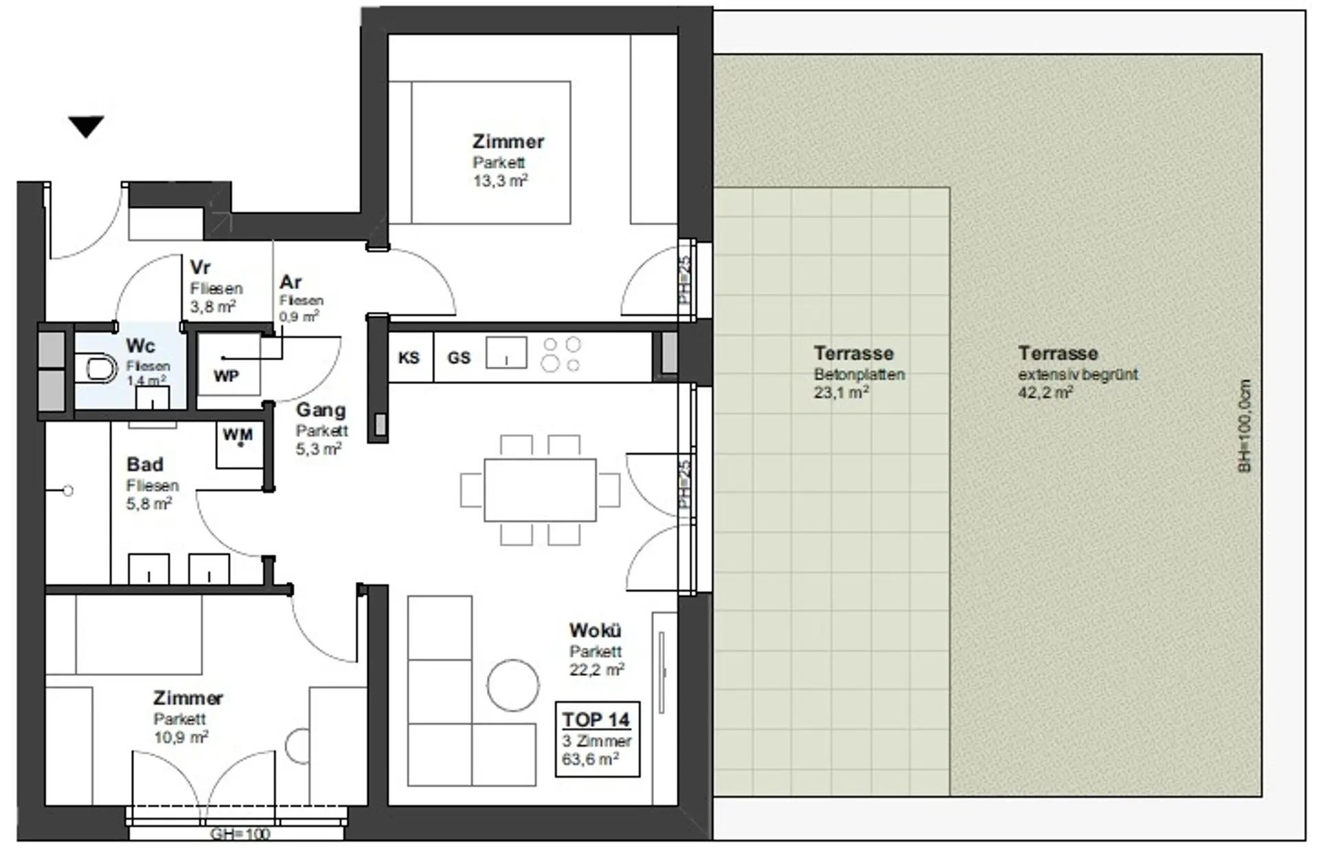 Die im Dachgeschoß geplante Wohnung Top 14 (Lift ist vorhanden) mit ca. 63,6 m² Wohnnutzfläche und einer Terrasse mit ca. 65,3 m² verfügt über folgende Raumaufteilung: